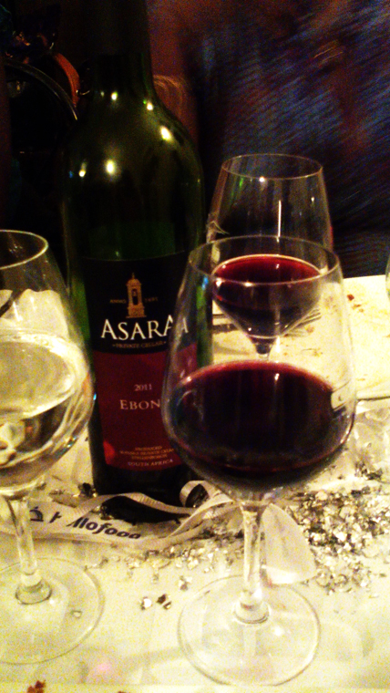 Servi au début mais dégusté tout le long du diner, Asara Ebony, très bon vin Sud-africain offert par Roxane de Vins du cape. Elle tient un espace assez particulier… On n’y vend pas que du vin, on peut en acheter mais aussi le déguster sur place ou en déguster d’autres ! Que vous soyez en zone 4 ou aux II plateaux, vous pourrez toujours vous en procurez. Je parle du vin bien sur :-p