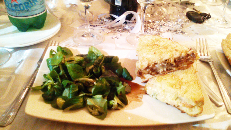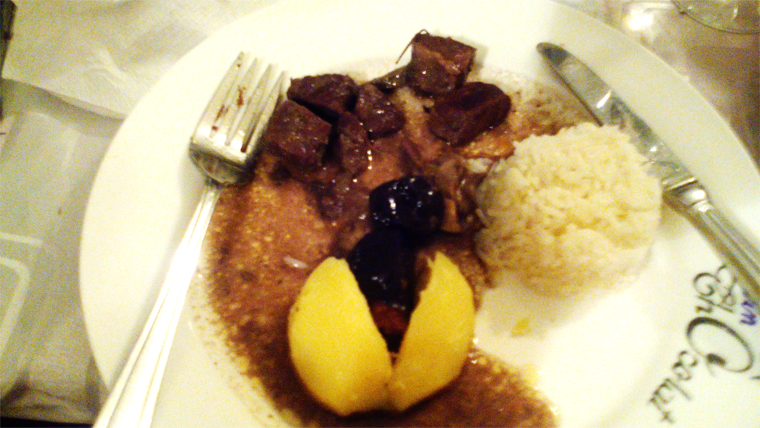 En tant qu’hôte ce fut à elle de nous servir le plat de résistance. Un bœuf bourguignon et ses pruneaux au foie gras accompagné de pomme de terre vapeur et riz. Voyez-vous-même mon assiette comme elle était appétissante !