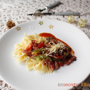En plat principal, je vous propose des farfalles aux lardons et aux poivrons, pour changer du traditionnel spaghetti au poulet, mais si vous ne mangez pas de porc, vous pouvez simplement utiliser de la dinde émincée, ce sera tout aussi bon. … Lire la suite Mon menu festif (2)